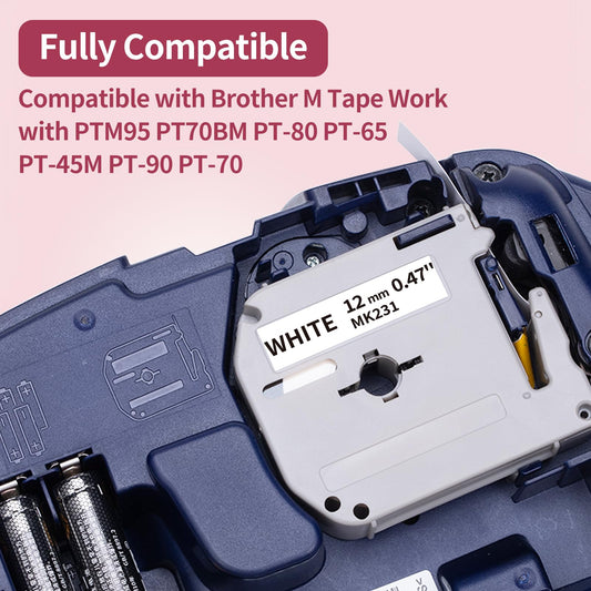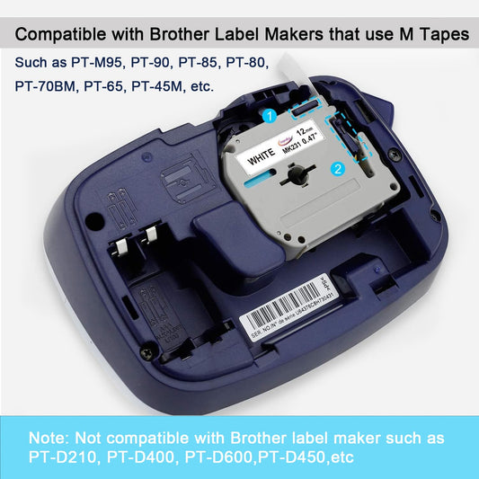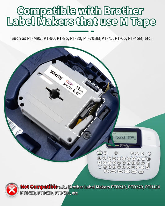 PT70BM PT-M95 PT-80 PT-65 PT-45 PT-90 PT-70 Label Tape Replacement for Brother M231s MK-231 M-K231 MK231 EMK-231 P-Touch M Tape 12mm 0.47'' White, 12mm x 8m, 6 Packs
