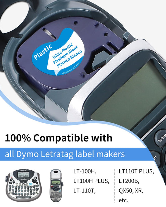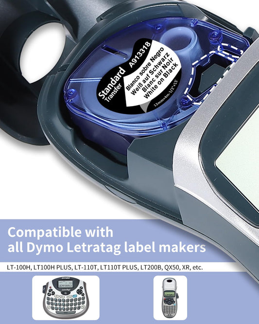 Anycolor Compatible with Dymo LetraTag Refills White on Black Plastic Tape 913318, 12mm x 4m (1/2 Inch x 13 ft) Compatible with Dymo LetraTag LT-100H LT-100T LT-110T QX50 Label Maker, 5-Pack