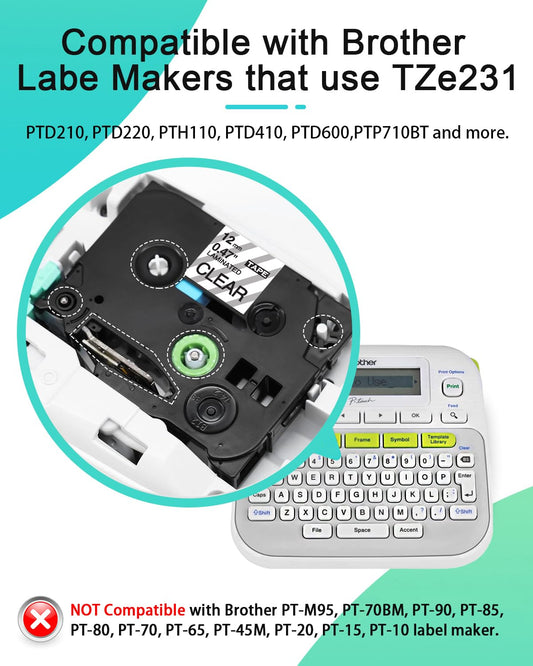 Anycolor Compatible Label Tape Replacement for Brother TZe-131 TZ Tape 12mm 0.47 Laminated Clear Label Maker Tape, Work for PT-D210 PTH110 PTD400 PTD600 Label Maker